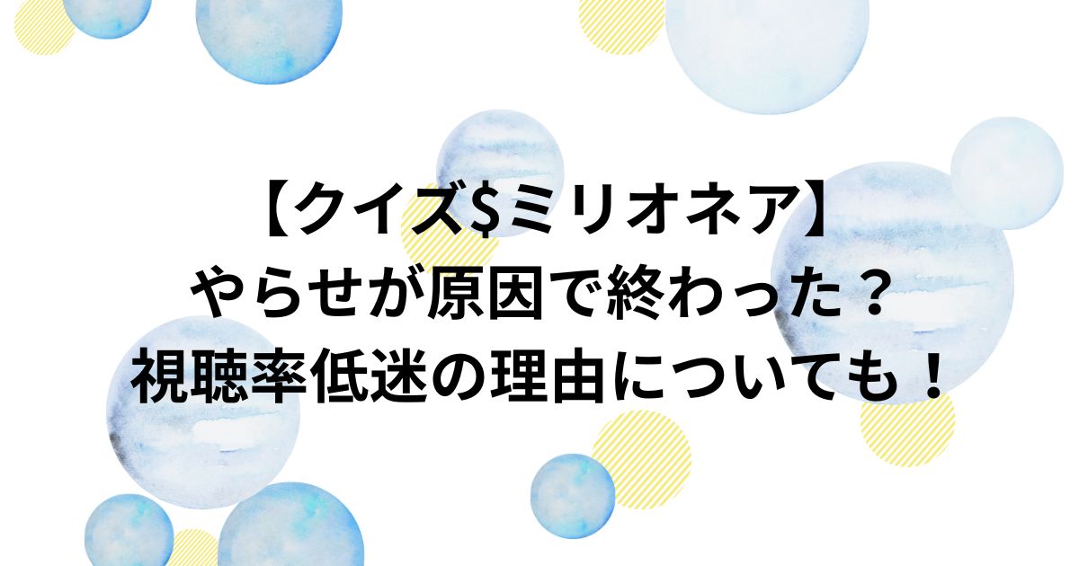 インターネット上では「クイズ$ミリオネア」「やらせ」という言葉が並んで検索されがちですが、番組終了の公式理由は視聴率の低下です。